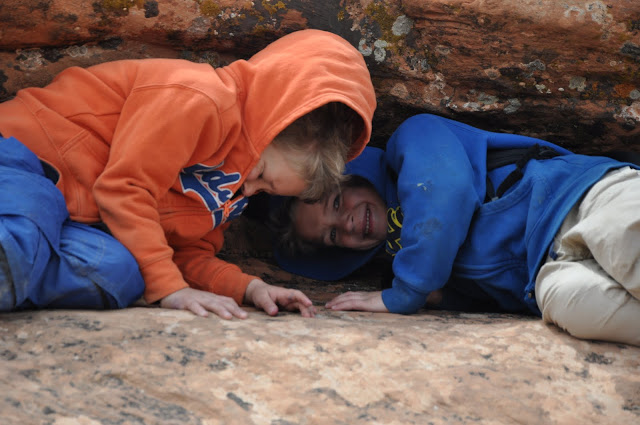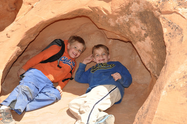 Zack, Matthew and I headed to check out a couple of other arches they had up there. Apparently, the Double O Arch was awesome and the kids were so excited about doing something dangerous. They loved it! Dave said the trail would have been fine without the wind, but that it was scary with the wind. The other arches up there were Navajo Arch and Partition Arch. Zack and Matthew were having great fun climbing on the rocks and playing in the crevices near Navajo Arch.